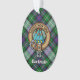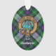Crachá da crista Clan MacKenzie rodeado por uma correia e fivela sobre o fundo de tartan vestido. Texto personalizado de ambos os lados.