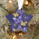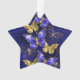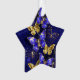 Composição de borboletas luxuosas de safira e joias de ouro em fundo azul texturizado.