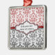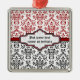 ornamento cor damasco preto vermelho branco. A parte superior é de cor damasco vermelha e branca e a parte inferior é de preto e branco. Uma faixa vermelha separa as duas partes. Seu texto é digitado em um rótulo elegante com contorno branco e vermelho. Um excelente para casamentos especiais, aniversários.