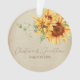 Este romântico ornamento de manutenção de casamento apresenta um design floral vintage. O fundo é um design de papel pergaminho, com aspecto rústico e esmaecido, acentuado com ouros de girassol a cores. No topo, figura um delicado buquê selvagem, com os nomes do casal impressos abaixo.