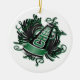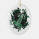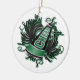 Os poms e o megafone pretos e verdes são cercados pelas palavras do "espírito do orgulho da força da lealdade elogio"