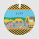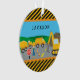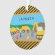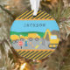 Got a little boy who loves construction vehicles? This custom Christmas ornament is perfect! The holiday ornament has a dump truck, cement truck, and excavator, all working together at a road construction site. A young boy stands near the front with a stop sign to help stop traffic. There are also orange safety traffic cones and background mountains and blue sky. Finish the ornament with your young man's first name on the front and year on the back.