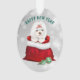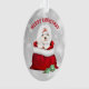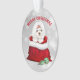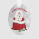 Um adorável pop de cão Shih Tzu branco a sair de um saco de presentes vermelho na frente deste Enfeites de natal. Algumas bolbos de árvore de Natal, com padrão de ouro e lacrimejo, estão bem na frente do saco de Papais noeis. O texto acima da imagem diz "MERRY CHRISTMAS" em vermelho. A imagem e o texto são colocados sobre um fundo prateado de abstrato. A parte de trás do ornamento tem a mesma imagem, mas com o texto "FELIZ ANO NOVO" em verde-real.