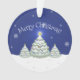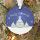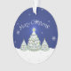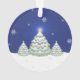Adicione um toque caprichoso à sua árvore de Natal com um Ornamento de Árvore de Natal Azul. Design de ornamento apresenta um trio de Árvores de Natal decoradas em neve com flocos de neve em queda contra um fundo azul. Itens adicionais de presentes e feriados disponíveis com este design também.