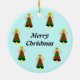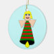 Esta divertida decoração festiva da árvore de Natal apresenta um bonito Anjo de Natal com cabelo louro, olhos azuis e um sorriso grande. O corpo dela é um sino verde festivo e vermelho, com um aplauso amarelo no fundo. O fundo é um tom pálido de azul. O Anjo aparece uma vez na frente do ornamento e circula as palavras "Feliz Natal" na parte de trás do ornamento. O texto é personalizável para permitir que você personalize este presente se quiser.