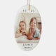 Comemore as alegrias simples das festas com um Enfeites de natal oval 2 fotocerâmico. As imagens e todos os textos neste modelo são simples de personalizar e podem ser diferentes ou iguais em frente e atrás. As cores e os estilos de fonte também são fáceis de personalizar com a ferramenta Editor de Design Zazzle. O moderno minimalista design preto e branco apresenta duas imagens de sua escolha e nomes clássicos de tipografia e ano. Crie a sua única guardiã para decorações de casa de Natal ou dê como um simples presente elegante para a família e amigos.