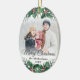 Celebre as simples alegrias das festas com um ornamento de cerâmica oval personalizado com duas fotos e a mensagem "Feliz Natal". As imagens e todo o texto neste modelo são fáceis de personalizar e podem ser diferentes ou iguais na frente e no verso. O texto pode ser alterado para "Primeiro Natal", "Saudações de Fim de Ano", um nome ou outro texto de sua escolha. O design oval moderno em vermelho, verde e branco apresenta folhas e frutos de azevinho botânicos, tipografia de texto clássico e elegante, e 2 fotos favoritas. Este enfeite de Natal único adiciona um toque sofisticado às decorações de Natal em sua casa. Feliz Natal!