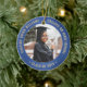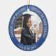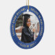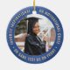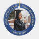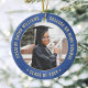 Comemore a conquista do formando com um elegante Enfeites de natal de graduação azul e dourado, com duas fotos redondas. As imagens e todo o texto são simples de personalizar e podem ser diferentes na frente e no verso. Inclua qualquer citação inspiracional favorita, ditado motivacional, nome e grau da escola, parabéns, obrigados, mãe e pai, ou outra mensagem de sua escolha. Design apresenta uma borda real azul esfregada de aço inoxidável, nome personalizado da tipografia moderna, escola e ano de aula em círculo, e duas fotos do formando, como fotos ou imagens do mais velho da cerimônia inicial. Observe que o ouro é impresso a cor, não a folha metálica. Faz uma ideia séria da formatura.