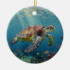 A sea turtle themed Holiday Ornament with an illustration of a sea turtle under a calm teal sea swimming among the coral on the ocean floor with sun rays beaming down on him through the aqua water. Add a coastal feeling to beachy Christmas.