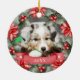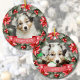 Enfeite de Natal de Cerâmica para Cachorro com Moldura Floral Clássica. Capture o espírito natalino do seu animal de estimação com este encantador enfeite de Natal com duas fotos, lindamente emoldurado por um poinsettia em aquarela e uma grinalda de sempre-vivas em ambos os lados. Cada lado é projetado com uma faixa de fita vermelha festiva na parte inferior, acentuada por pegadas brancas fofas para um toque divertido. A frente exibe o nome do seu animal de estimação e o ano, enquanto a parte de trás mostra o ano novamente em um tamanho maior, tornando-o um souvenir verdadeiramente personalizado. Este enfeite personalizado traz um charme tradicional e botânico com tons ricos de vermelho e verde, perfeito para os amadores de animais que desejam celebrar seu cachorro ou cão de uma maneira festiva e memorável. Ideal como um presente ou