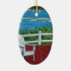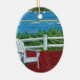 This vivid oil pastel painting features a white Adirondack chair on a red brick padiatio overlooking Cape Cod. Brilliant green, blue, red, and yellow create a stunning summer seascape on the New England Coast.