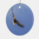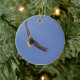Uma águia-careca adulta numa curva afiada, realçada por um céu azul.