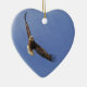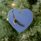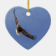 Uma águia-careca adulta numa curva afiada, realçada por um céu azul.