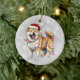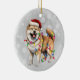 Na frente deste ornamento de Férias está uma imagem de um cachorro Akita fofo vestindo um chapéu de Papai Noel e embrulhado em luzes coloridas de Natal. A imagem é colocada contra um fundo festivo de prata. A parte de trás do ornamento tem o mesmo fundo com o texto personalizado em vermelho e verde. Engraçado para qualquer um, mas especialmente para crianças de pais ou avós.