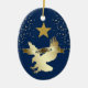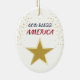 Aqui está um Enfeites de natal patriótico bonito que é único! A frente apresenta uma estrela dourada reluzente e uma águia-reluzente de ouro da silhueta prestes a aterrissar. Através das asas da águia há uma faixa de ouro que diz AMÉRICA. O ouro brilhante confunde os lados esquerdo e direito, e tudo é colocado sobre um fundo azul escuro. A parte de trás do ornamento é branca, com as mesmas bordas de confete dourado, uma estrela dourada maior, e seu texto personalizado contido em um campo azul e um campo vermelho.