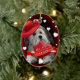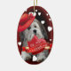 O filhote de cachorro adorável de Havanese que veste o chapéu vermelho do feriado contra a gota traseira dos corações brancos traz uma mensagem do amor e faz uma decoração do divertimento para a árvore de Natal.