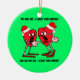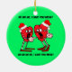 Ho ho ho, eu te amo mais! Nenhum ho ho ho, eu te amo mais! Dois corações vermelhos com os chapéus do papai noel que discutem sobre quem se ama mais. Enfeites de natal engraçados dos amantes para decorar a árvore do feriado.