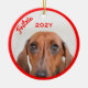 A frente deste Enfeites de natal fotográfico é personalizada com sua foto cercada por uma borda vermelha. Personalize-o com o nome do seu cão e o ano. Ao contrário, há uma impressão divertida com um padrão vermelho e verde de salsicha e um fundo bolinhas. Um presente memorável para mães e pais de Dachshund serem tesoureiros ano após ano.