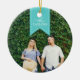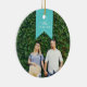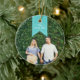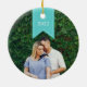 Personalize esse adorno cerâmico elegante com uma foto de cada lado para comemorar um ano especial. Personalize a frente com seu nome de família em branco em uma faixa vibrante de friso de cor turquesa e adicione o ano às costas.