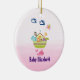 Um ornamento decorativo personalizado para bebês. Projetado com uma ilustração fofa no estilo de berçário com uma arca cheia de animais selvagens e uma borboleta voando sobre si e uma baleia amigável jorrando água abaixo. Algumas nuvens azuis flutuam por aqui. Colocado sobre um fundo sombrio de rosa claro.