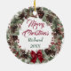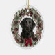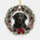 Na frente deste ornamento de Feriado está uma imagem de um belo Labrador Retriever preto, enquadrado por um bonito cone de pínus de aquarela e uma coroa de Feriado de Amoras. A imagem do cachorro está no centro em um fundo branco. Um arco vermelho brilhante dá um pouco de brilho de Natal à coroa. O verso do ornamento tem a mesma coroa com o texto personalizado em vermelho e verde escuro.