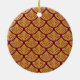Um padrão de sereia se dimensiona em uma cor magenta escura, com fundo dourado. As escalas estão no estilo de deco de arte.