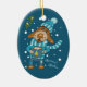 Um adorno de cerâmica azul giro para sua árvore de Natal com um cão bebendo uma xícara de cacau quente com marshmallow. © ArianeC Ilustrações — Todos os direitos reservados