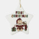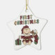O primeiro ornamento de Natal de um bebê adorável com um bebê de terno vermelho e boné de estocagem e texto multicores que diz "Primeiro Natal"!