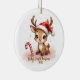 Commemorate baby’s very first holiday with this darling keepsake! A sweet little reindeer fawn wearing a tiny red Santa hat sits by a candy cane and beams with big, sparkling eyes. Soft blush pinks and snowy sparkles surround the words “Baby’s First Christmas 2025” in whimsical script.