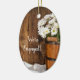Celebre o seu primeiro Natal como um casal recém-noivo e comemore o dia especial com o encantador Balde de Madeira e Ornamento Oval do Noivado de Margarida Branca. Este costume rústico de chic que estamos engajados apresenta uma fina fotografia floral de um balde de madeira repleto de um buquê de flores margaridas brancas com um fundo de madeira marrom e curada.