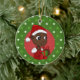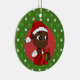 Ornamento cerâmico com ilustração de um bebê afro-americano sorridente, segurando um presente de Natal e vestindo um chapéu de Papai Noel; em um círculo vermelho sobre fundo verde com estrelas, um design de Natal com um modelo de texto editável para seu nome ou mensagem