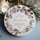 Celebrar o primeiro Natal do bebê com este ornamento de manutenção, com uma coroa aquosa de folhas roxas e verdes, bagas roxas e flores cor-de-rosa. A palavra "Natal" aparece num delicado guião roxo de escrita manual. Personalize o ornamento com o nome do bebê e o ano em fontes roxas sans serif.