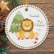 Aproveite o primeiro Natal do seu bebê com este leão segurando uma bengala doce sentada em frente à árvore. Foi feito um modelo para personalizar nome e ano!