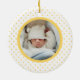 Enfeites de natal elegante, moderno e fofo para bebês sobre o padrão de bolinhas amarela. Este modelo com uma ilustração adorável de dinossauro bebê rosa dormindo sob as estrelas amarelas douradas com o nome de Bebê personalizado. Inverta para revelar uma linda foto de bebê em círculo vermelho listrado. Excelente para o bebê e para a menina. Presente perfeito para todas as estações!