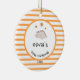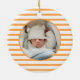 Elegante, moderno e fofo Enfeites de natal de fotos de bebês em um padrão de listras laranja. Este modelo com uma ilustração adorável de dinossauro bebê rosa dormindo sob as estrelas amarelas douradas com o nome de Bebê personalizado. Inverta para revelar uma linda foto de bebê em círculo vermelho listrado. Excelente para o bebê e para a menina. Presente perfeito para todas as estações!
