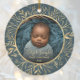 Celebrar o primeiro Natal do bebê com este lindo ornamento de keepape. Substitua facilmente a imagem de exemplo por sua própria foto favorita e personalize-a com o nome do bebê na fonte de script dourada e no ano abaixo. Uma tela de gradiente preto ajuda a fazer o pop de texto. A foto é disparada por uma elegante armação redonda decorada com folhagem de folhas de folhas douradas desenhadas à mão sobre fundo azul lacrimogêneo.