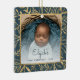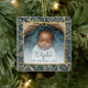 Celebrar o primeiro Natal do bebê com este lindo ornamento de keepape. Substitua facilmente a imagem de exemplo por sua própria foto favorita e personalize-a com o nome do bebê na fonte de script azul teal e no ano abaixo. Uma tela de gradiente branco ajuda a fazer o pop de texto. A foto é tirada por um quadro quadrado elegante, decorado com folhagem dourada, desenhada à mão, sobre fundo azul lacrimogêneo.