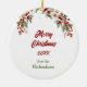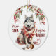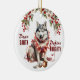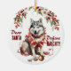 Na frente deste ornamento de Feriado está a imagem de um cão Husky Siberiano sentado com um ornamento de árvore quebrada na frente dele. Ele está embrulhado em um fio de luzes de Natal brilhantes. O texto vermelho diz "Caros PAPAIS NOEIS Definem NASCIDOS". No verso, o texto vermelho e verde diz MERRY CHRISTMAS", e há campos de texto adicionais para você personalizar o que quiser.