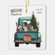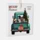 A teal blue retro pickup truck carries a decorated Holiday tree and gift packages on this cute Christmas ornament. Looking out from the tailgate is a beautiful Bernese Mountain dog. A rustic wooden sign on the back bumper says "Christmas Cheer". The red and green stylized text at the top left says "MERRY CHRISTMAS", with your name (or your dog's) and the year at the right. Both sides have the same image.