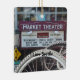 As bicicletas estacionaram pelo mercado de lugar de piques acima do teatro velho do mercado no beco do cargo em Seattle. Somente as partes superiores das rodas das bicicletas são visíveis, com a marca do teatro atrás delas. A marca anuncia o tonk da comédia e do honky do improv. A cidade vibrante de Seattle é um de nossos favoritos. As pessoas, a música, o teatro. As colinas. Mercado de lugar de piques. A comida. Cafés exteriores no cais. Quadrado pioneiro. Barcos no som. Balsas através do som. Tudo sobre esta cidade é original.