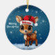 Blitzen! Cute animal reindeer character, baby deer with antlers and personalizable Santa hat with festive blue snowy backdrop. Unique winter wildlife graphic with a light snow. Round ceramic ornament, with customizable Merry Christmas written in white. for decorating your holiday tree or as a thoughtful gift, this whimsical woodland doe decor makes a cherished keepsake for years to come. Customize by changing the text, the font, the font color, or remove the text. You can even transfer this cartoon fawn illustration onto other products. Enjoy this design your way! 🎄🦌