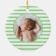 Enfeites de natal elegante, moderno e fofo para bebês sobre o padrão verde stripe. Esta modelo com uma ilustração adorável do dinossauro bebê azul dormindo sob as estrelas amarelas douradas com o nome de Bebê personalizado. Inverta para revelar uma linda foto de bebê em círculo vermelho listrado. Excelente para o bebê e para a menina. Presente perfeito para todas as estações!