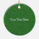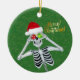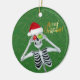 Este ornamento cerâmico pendurado tem um esqueleto de bobo segurando ornamentos vermelhos e verdes até seus olhos enquanto sorri e veste um chapéu vermelho de Papai Noel em um fundo verde com speck falsos de ouro. Feliz texto de Natal em ouro na frente. Personalize o texto no verso com o modelo.