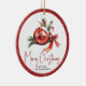 Núcleo de bola de Natal com arco vermelho e ramos de abeto feriados Ornament cerâmico. Ele apresenta um Enfeites de natal vermelho com um arco vermelho e ramos de abeto. À sua volta há uma borda vermelha com flocos de neve brancos. A parte de trás contém uma bela foto de família com a mesma borda.