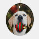 O jovem labrador amarelo tem um Enfeites de natal na boca pensando que é um cão-bola que ama o ornamento de Natal