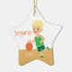 Personalize este adorável enfeite de basquete para o rapaz amante do esporte na sua vida! Este ornamento apresenta um menino louro a conduzir basquete numa quadra de basquete. Também disponível em outras cores para personalização extra.