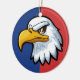 Este ornamento apresenta um determinado design de cabeça de águia no estilo de desenho animado contra um fundo azul e vermelho vibrante.