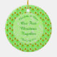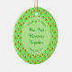 Este ornamento foi projetado para um novo casal passando seu primeiro Natal juntos como homem e esposa. A design apresenta um padrão de bonito flores cor-de-rosa de maçã. São 2 tons de rosa diferentes e todos têm um meio amarelo. Eles são ideais para o Casamento da primavera e são misturados entre maçãs. Cada maçã é verde, com uma pincelada vermelha de um lado e um pequeno caule castanho. Há um círculo verde claro com padrões brancos marmoreados que contém texto personalizável para que você possa incluir todos os detalhes importantes.