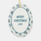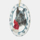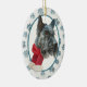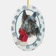 Na frente deste ornamento de Férias está uma bela imagem de aquarela de um Terrier negro vestindo um lenço vermelho de inverno. A imagem é colocada em um oval branco moldado em azul de cinza e bordado por um padrão de impressão de pata de cinza. A parte de trás do ornamento tem a mesma borda com seu texto personalizado no centro. Perfeito para quem é dono de um cão escocês brincalhão.