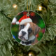 Cachorro branco e desfiladeiro veste um chapéu de Papai Noel muito pequeno e fica bonito com luzes de Natal brilhantes no cão de fundo amante ornamento cerâmico de Natal